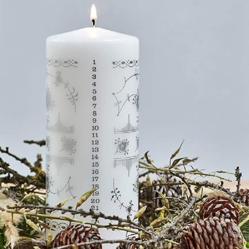 Kalenderlys i musselmalet mønster med sølv Dette smukke kalenderlys i musselmalet mønster med sølv er den perfekte dekoration til julen. Med sin kunstige stearinlys-effekt vil det skabe en hyggelig og varm atmosfære i dit hjem. Lysene er lavet af høj kval