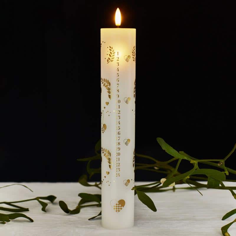 Sille kalenderlyset Special Edition 2025 har et elegant og dekorativt design. Lyset er fremstillet af ægte stearin og dekoreret med gyldne mønstre, herunder blade og hjerter, som smukt pryder overfladen. Stearinlyset har en pulserende, naturtro 3D LED-fl